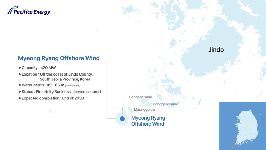 Pacifico Energy Korea has secured approval for an Electricity Business License (EBL) from the Ministry of Trade, Industry and Energy (MOTIE) for its 420MW Myeong Ryang Offshore Wind Project located off the coast of Jindo County, South Jeolla Province. The EBL confirms the project’s site boundaries and capacity, allowing Pacifico Energy Korea to commence the key permitting process. This milestone is also expected to accelerate Pacifico Energy Korea’s development of the 3.2GW Jindo offshore wind project cluster.